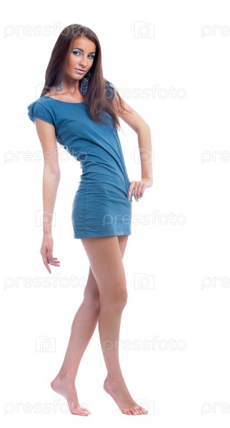 Стройная девушка в синем платье на белом