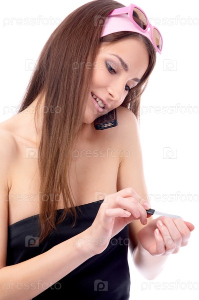 Модель в розовых очках - делает маникюр и говорит по телефону