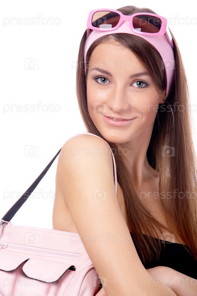 Модель в розовых очках и с розовой сумкой, улыбается - на белом