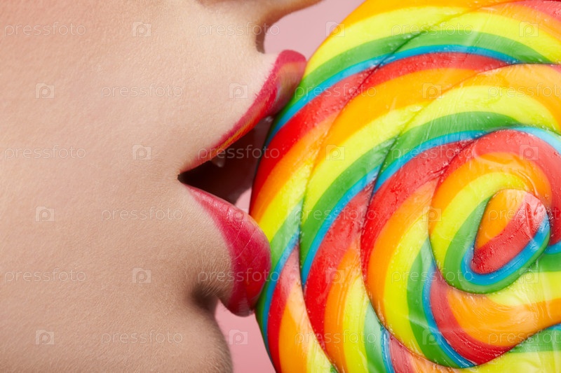 Девушка лижет большой леденец, крупный план