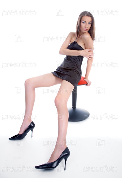 Девушка в черном коротком платье сидит на стуле, белый фон