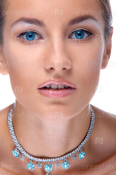 Голубоглазая девушка в ожерелье на белом