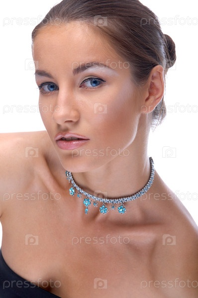 Голубоглазая девушка в ожерелье на белом