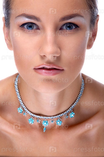 Голубоглазая девушка в ожерелье на белом