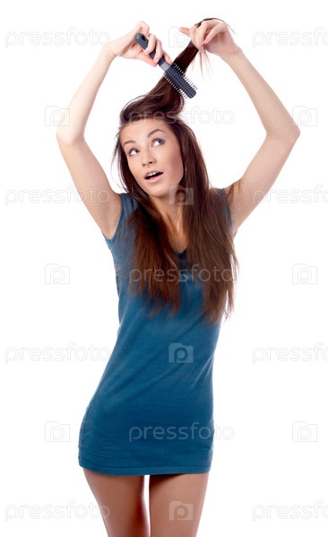 Брюнетка в синем платье причесывает волосы