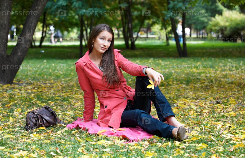 Портрет красивой девушки в саду - сидя на осенних листьях