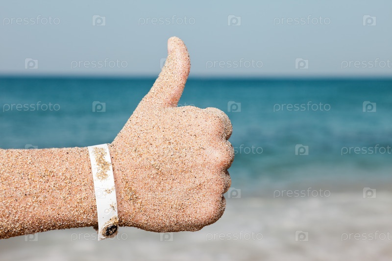 Летние каникулы - женщина подняла большой палец вверх,обсыпанный морским песком