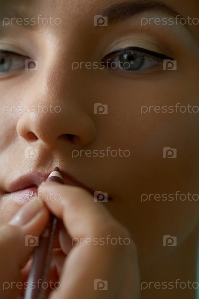 Девушке делают макияж, красят губы