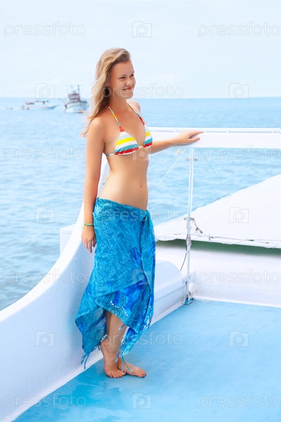Красивая блондинка в бикини и парео на палубе яхты