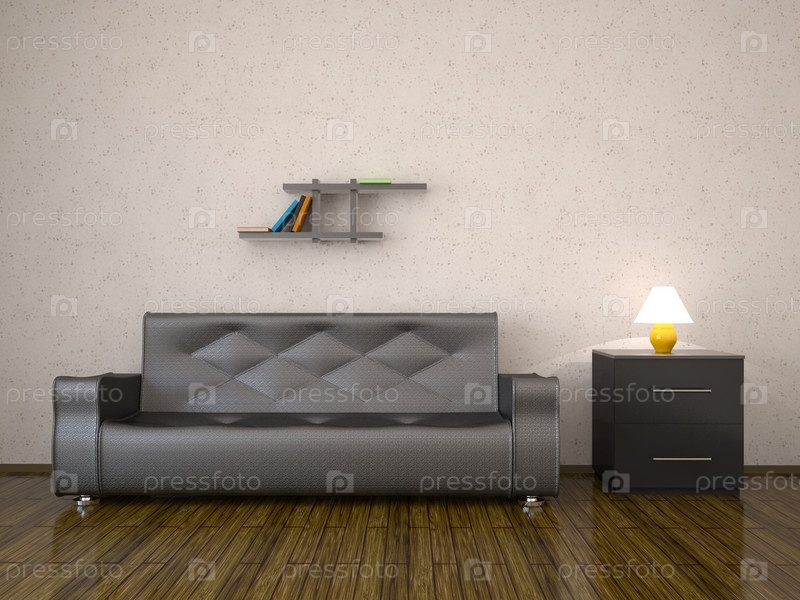 Комната с диваном, тумбочкой и полкой с книгами