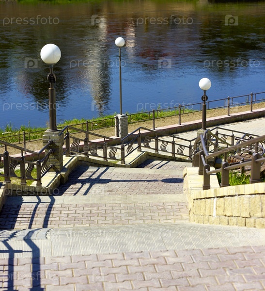 Спуск по лестнице с фонарями, лидер на речном причале