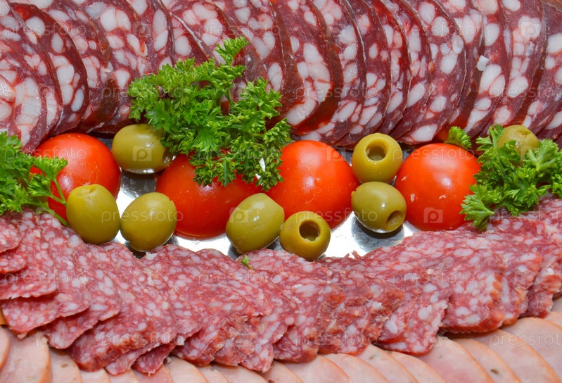 Разные виды колбасы, овощи и зелень крупным планом