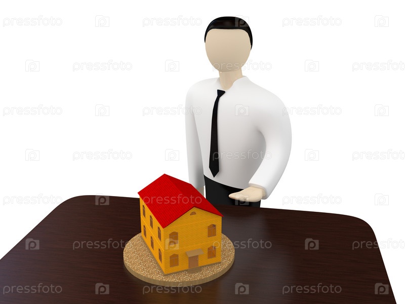 Фигура мужчины перед столом с домиком на белом фоне