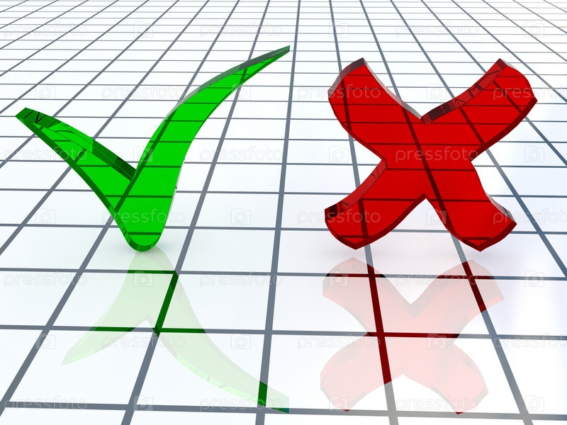 Галочка и крестик из стекла на клетчатом фоне