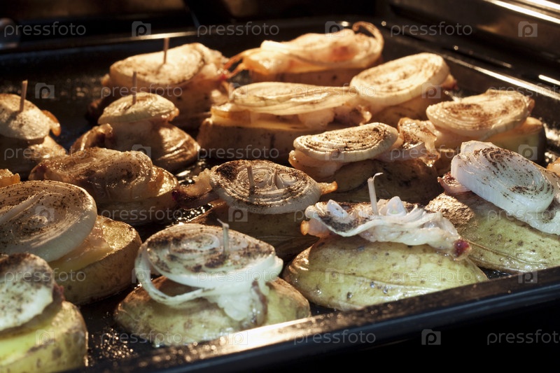 Жареный картофель с луком и беконом в духовке