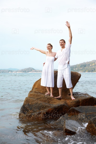 Счастливая пара на камнях на берегу острова Пхукет, Таиланд