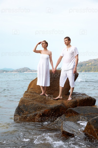 Счастливая пара на камнях на берегу острова Пхукет, Таиланд