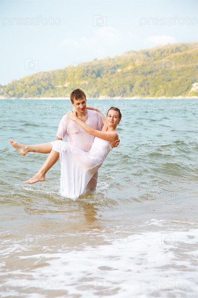 Счастливая пара купается у берега острова Пхукет, Таиланд