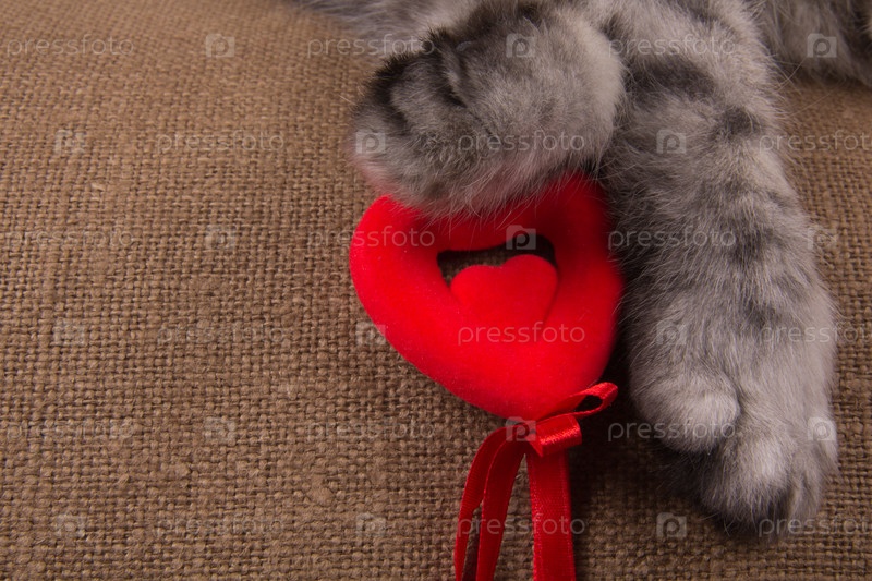 Красное сердечко к Дню Святого Валентина в лапах серого кота