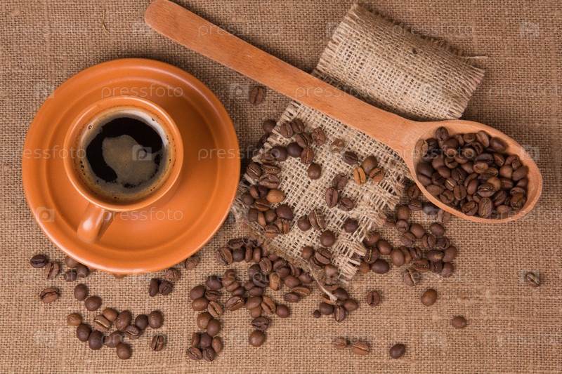 Деревянная ложка, кофейные зерна и чашка кофе