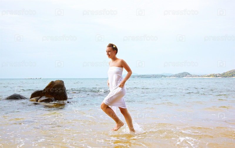Красивая девушка в белом хлопковом сарафане в лазурных волнах на острове Пхукет, Таиланд