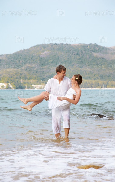 Молодая романтичная пара в одежде из белого хлопка на пляже острова Пхукет, Таиланд. Парень держит девушку на руках