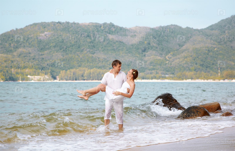 Молодая романтичная пара в одежде из белого хлопка на пляже острова Пхукет, Таиланд. Парень держит девушку на руках