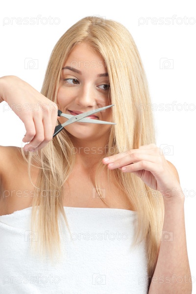 Красивая девушка собирается подстричь свои волосы и держит в руках ножницы