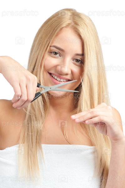 Красивая девушка собирается подстричь свои волосы и держит в руках ножницы