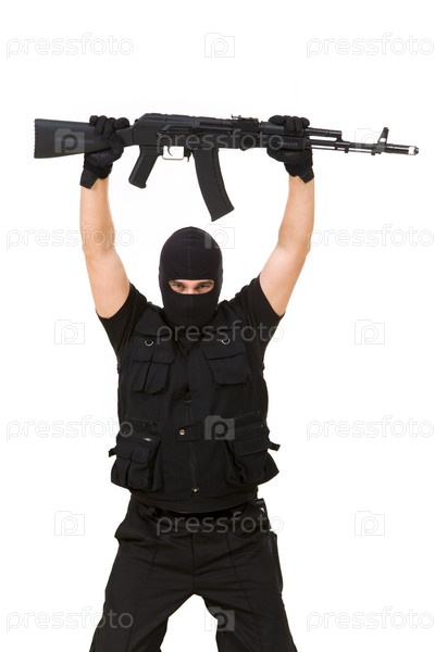 Портрет вооруженного убийцы, поднявшего винтовку в руках на белом фоне