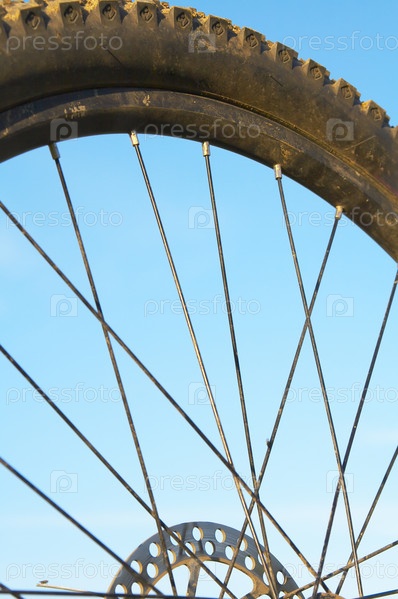 Часть велосипедного колеса с шиной, оболочкой, спицами и дисковым тормозом