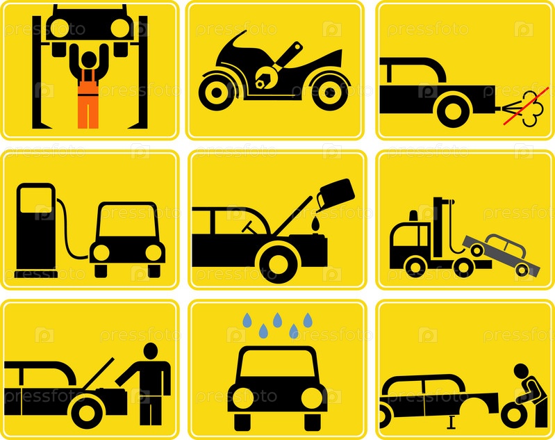 Автосервис - набор отдельных иконок: заправочная станция, смена шин, двигателя, моторных масел, мойка автомобилей. Желтые и черные знаки