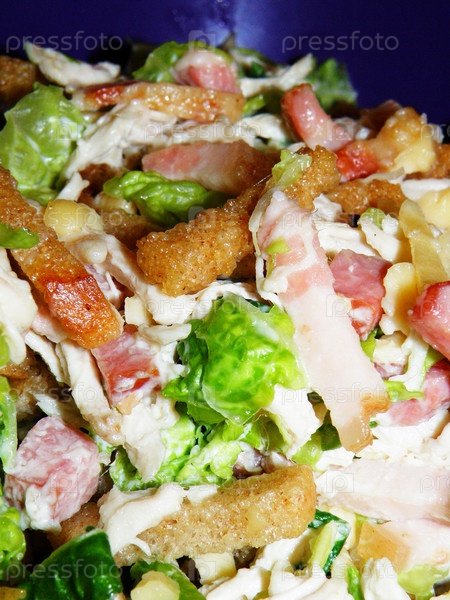 Салат из свиной корейки, сыра, сухариков, зеленых листьев салата- крупно