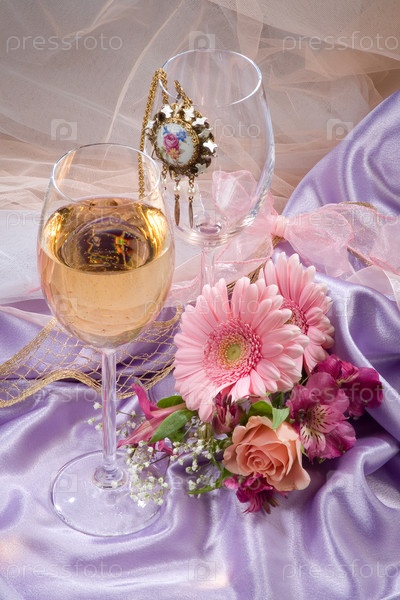 Два бокала, цветы и медальон на ткани