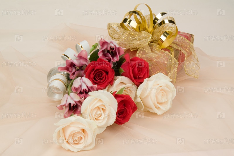 Красно-белые розы и коробка с золотым луком
