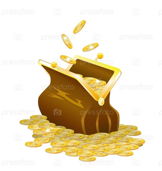 Кошелек и золотые монеты на белом фоне