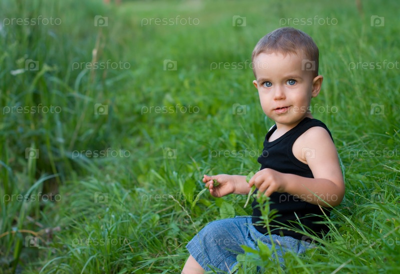 Мальчик сидит в зеленой траве