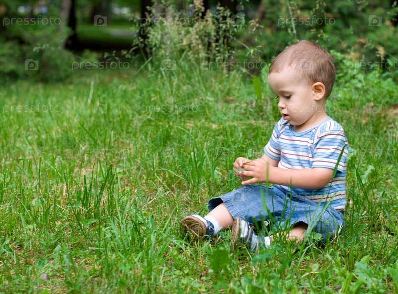 Мальчик сидит в зеленой траве