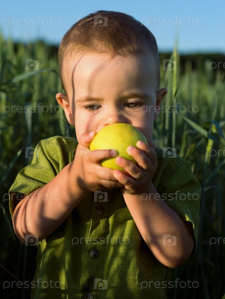 Мальчик с зеленым яблоком на свежем воздухе