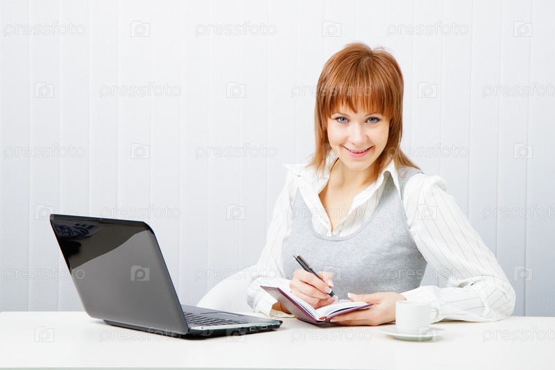 Девушка с блокнотом и ноутбуком за столом в офисе