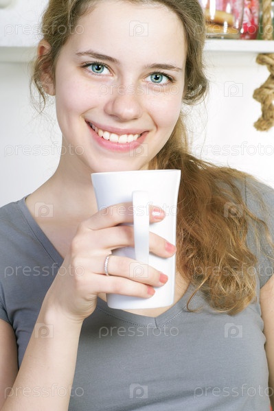 Красивая женщина пьет кофе на своей кухне