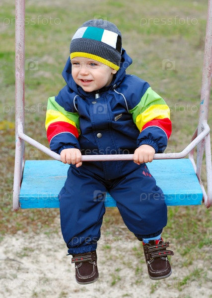Годовалый мальчик качается на качелях