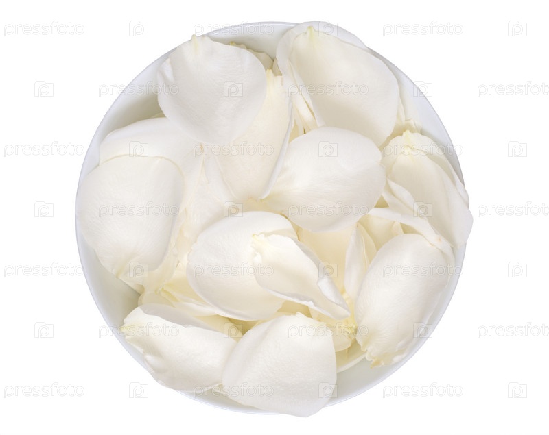 Белые лепестки роз в миске на белом фоне