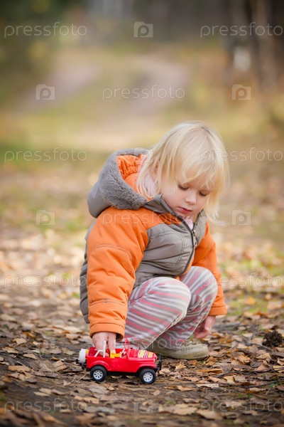 Маленькая девочка играет с машинкой на прогулке в осеннем парке