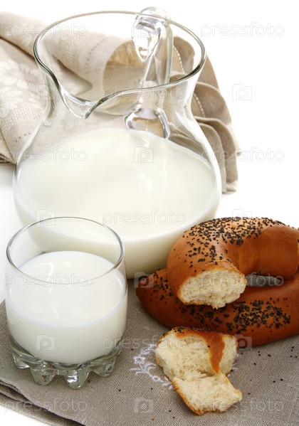 Бублик с маком, кувшин, стакан молока