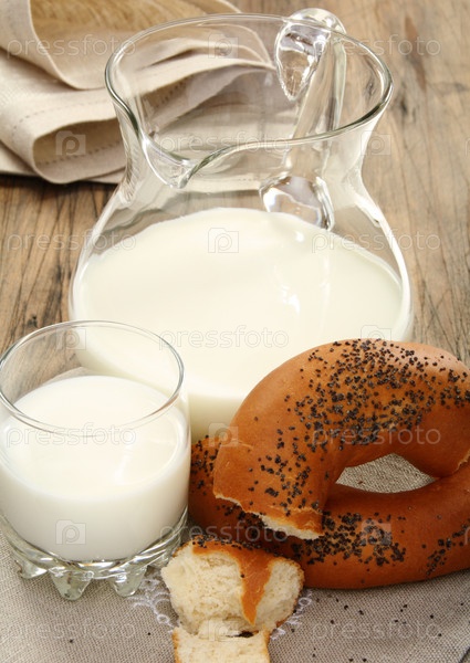Бублик с маком, кувшин, стакан молока