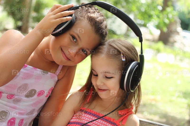 Две счастливые маленькие девочки слушают музыку в летний день