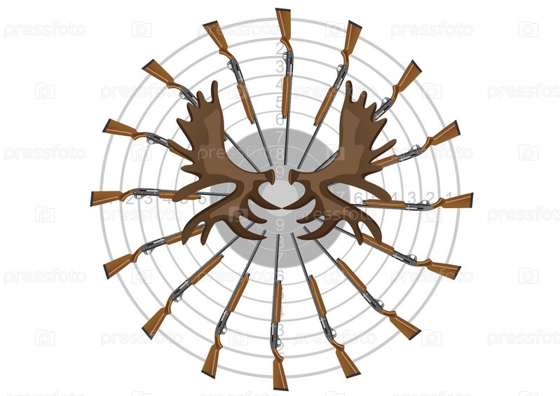 Иллюстрация. Ружья, оленьи рога, на фоне мишени
