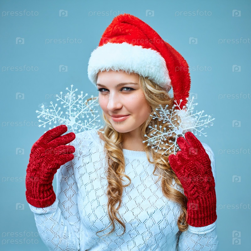 Красивая молодая женщина в одежде Санта-Клауса со снежинками