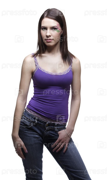 Портрет девушки с элементами боди-арта на виске, на белом фоне